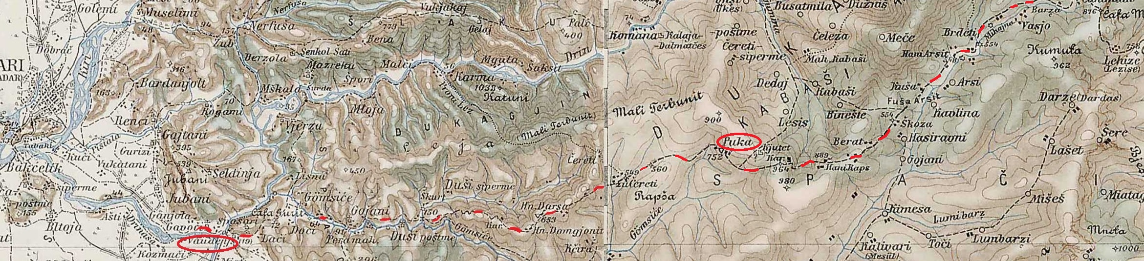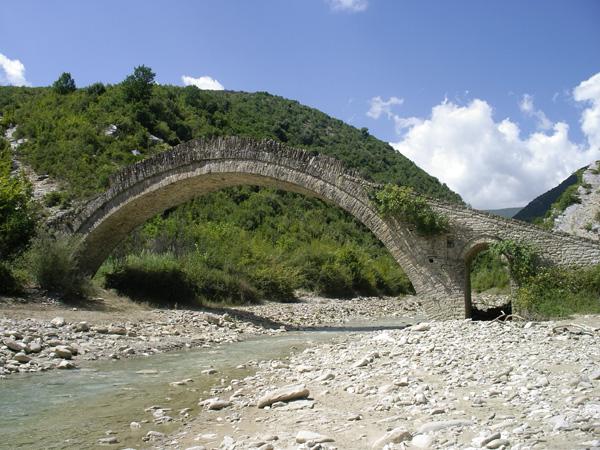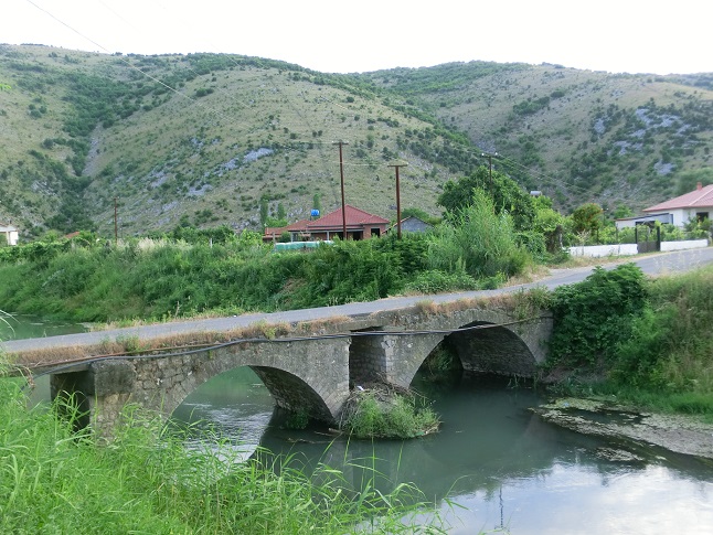 Wie wäre es mit 40.436642, 20.280586, bei bing ist diese Brücke deutlicher zu erahnen als bei google, auch der nördlich verlaufende Einschnitt parallel zum Fluss durch den Schluchtweg. Sinn der Brücke wäre eine Verbindung zu den Weideflächen nordöstlich des Dorfes Zaberzani