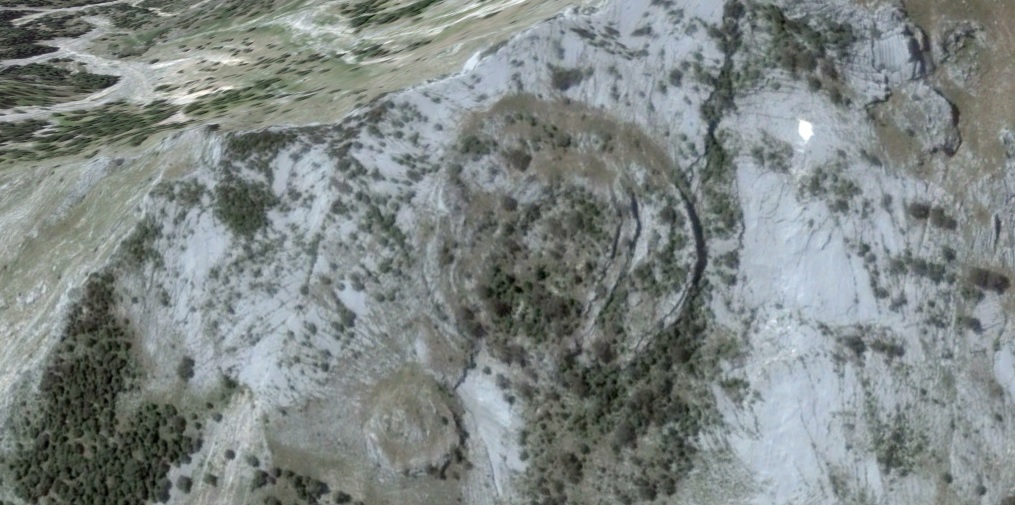 Im Höhlenthema hatten wir schon "Shpella e Shkrutar" bei Lepenica am Wickel. Nicht weit davon - über dem Nachbardort Brataj auf etwa 1.400 Meter Höhe - leistet sich die Natur im Karst eine kuriose Rundung mit drei ineinander liegenden Ringen. Der Durchmesser beträgt etwa 150 Meter. Das ist ein offizielles Naturdenkmal. Wer hat schon mal etwas ähnliches gesehen ?