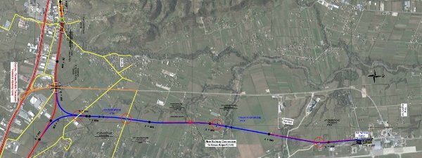 Aus welcher der Unterlagen hast du das entnommen? in den Karten (wie auch in der Karte oben) wird der Bahnsteig bei 41.418238,19.712757 (auf Google Maps) enden. Dafür muss die Straße auf dem Flughafengelände parallel zur öffentlichen Straße weichen.