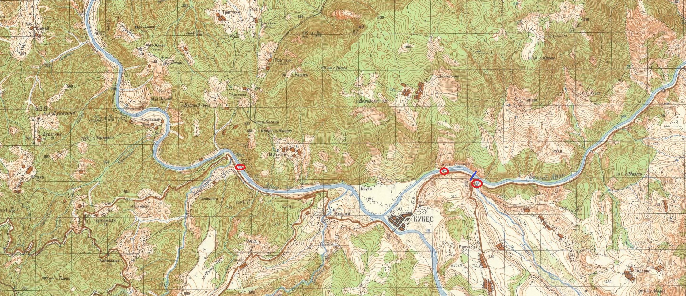 Die ungefähren Koordinaten der drei Brücken in dieser Zone sind 42.098987,20.421303 ; 42.101661,20.411468 und 42.10354,20.340536 (Ura e Vezirit)