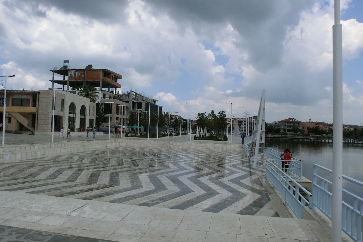 Sehr kurios sind die mit Abstand vor einige Häuser an der Fußgängerzone gebauten neuen Fassaden und dieser übrig gebliebene typisch albanische Rohbau, wo eine Etage ganz oben ausgebaut ist. Die Stadt erscheint sehr dörflich, der Patz kann wohl nur schwer belebt werden, und die Landschaft wirkt für mich irgendwie untypisch für Albanien. Ich denke, die Gegend ist nur ein Ziel für Reisende, die schon Alles in Albanien gesehen haben. Es fehlen die wirklich sehenswerten Punkte.