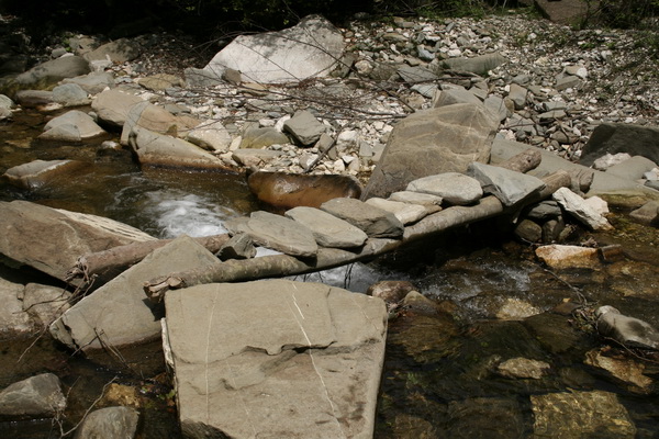 Ich empfehle für den Zugang zum Hauptwasserfall den üblichen Wanderweg entlang der Bogova. Der ist schön und deutlich weniger schweißtreibend. Die Einheimischen halten ihn relativ in Schuss, allerdings muss man über etliche Stellen ziemlich balancieren, siehe Bild.
