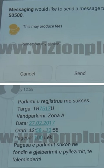 Man wählt die Zahlungsart mit Ticket ("TISPARK pagesa me ane te biletave"), drei Varianten werden angeboten: per nje ore (1 Stunde, blaue Karte): 50 Leke(40 Cent), per dy ore (2 Stunden, grüne Karte): 100 Leke (75 Cent) oder Ditore (ohne Zeitbegrenzung zwischen 8 und 20 Uhr, rote Karte): 600 Leke/(4,40 EUR).