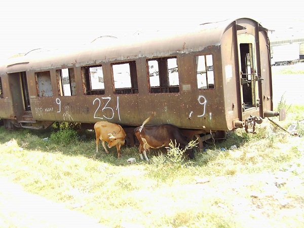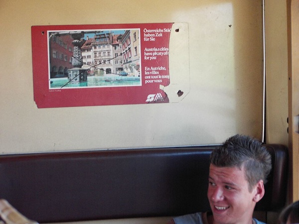 Und drin stell ich fest: Hat sich doch was geändert. Sind nicht mehr die Garnituren von vor 11 Jahren. Oben so Gepäcksracks in Zuckerrosa, die Scheiben größtenteils gebrochen. Von Steinschleudern zerschossen, wie uns ein Junge erklärt. Klingt plausibel.