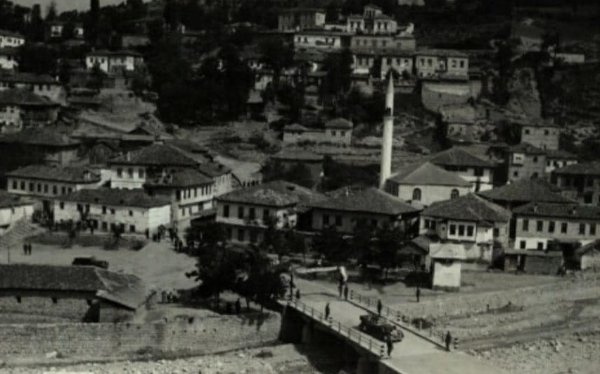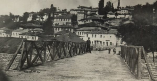 Die heute gesuchte Brücke liegt in einer albanischen Stadt mit charakteristischer Ansicht (ca. 1918-1920). Noch heute fährt man dort auf einer Nationalstraße über das Gewässer, aber der Bereich ist stark bebaut und die Brücke kommt kaum zur Geltung. Wo?