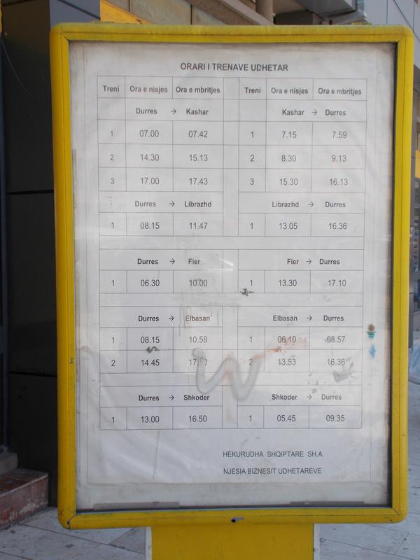 Es gibt im Moment 2 tägliche Züge Dürres-Elbasan. 7.20 (von Kashar) und 13.25. Elbasan-Dürres 6.25 und 13.37 (weiter nach Kashar).
