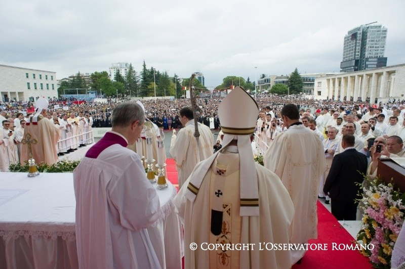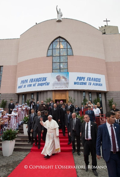 Auf dem Mutter-Teresa-Platz vor dem Universitätshauptgebäude hielt er eine Messe, nachdem er mit diversen Politikern im nahem Präsidentenpalais zusammengekommen war. Zehntausende säumten den zentralen Boulevard, wo er winkend vorbeifuhr und wo die Messe auf Grossbildschirmen übertragen wurde. Danach folgte noch ein vollgepacktes Programm: Mittagessen mit albanischen Bischöfen, Austausch mit Vertretern aller Religionen Albaniens, Messe in der katholischen Paulus-Kathedrale mit katholischen Priestern und Ordensleuten, Begegnung mit den Kindern des Bethanien-Zentrums von Bubq westlich von Fushë-Kruja und eine kurze Abschiedszeremonie auf dem Flughafen von Tirana, wo er auch noch Edi Ramas neugeborenen Sohn segnete.