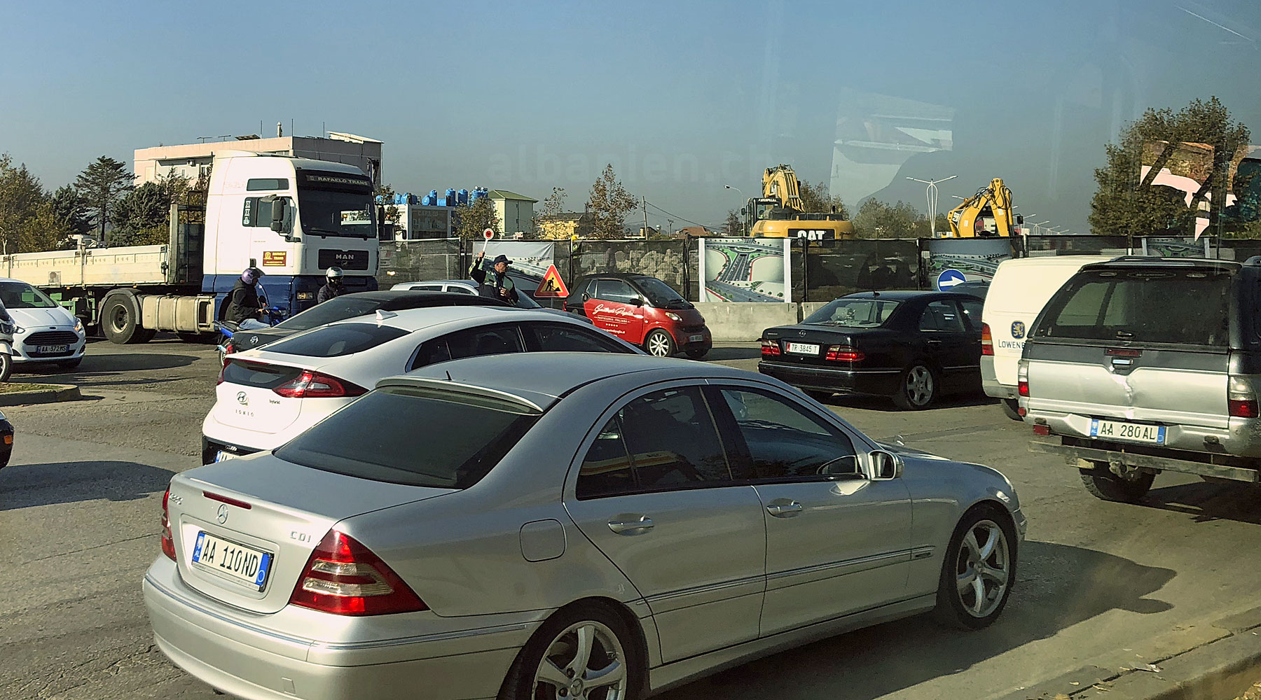 Mit neuen Brücken und Unterführungen und breiteren Strassen am »äusseren Ring« versucht die Stadt Tirana dem immer grösser werdenden Verkehrschaos Herr zu werden. Das Monument des schwarzen Adlers am Eingang in die Stadt musste schon weichen, weil bald eine Brücke den Verkehr über den Kreisel führen soll.