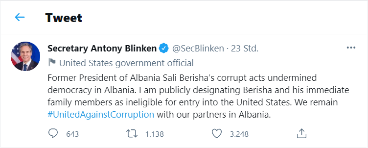 Tweet von US-Aussenminister Antony Blinken zu Sali Berisha
