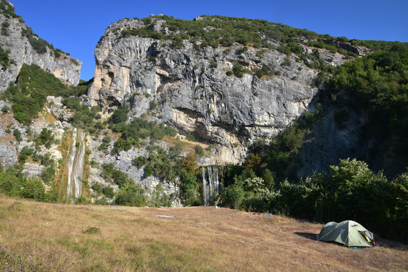 Etwa ab September soll das Wasser jedoch versiegen (Auskunft eines Hirten vor Ort). Wildzelten auf einer (leider vermüllten) Wiese oberhalb vor den Wasserfällen mit wunderbaren Blick auf diese möglich.