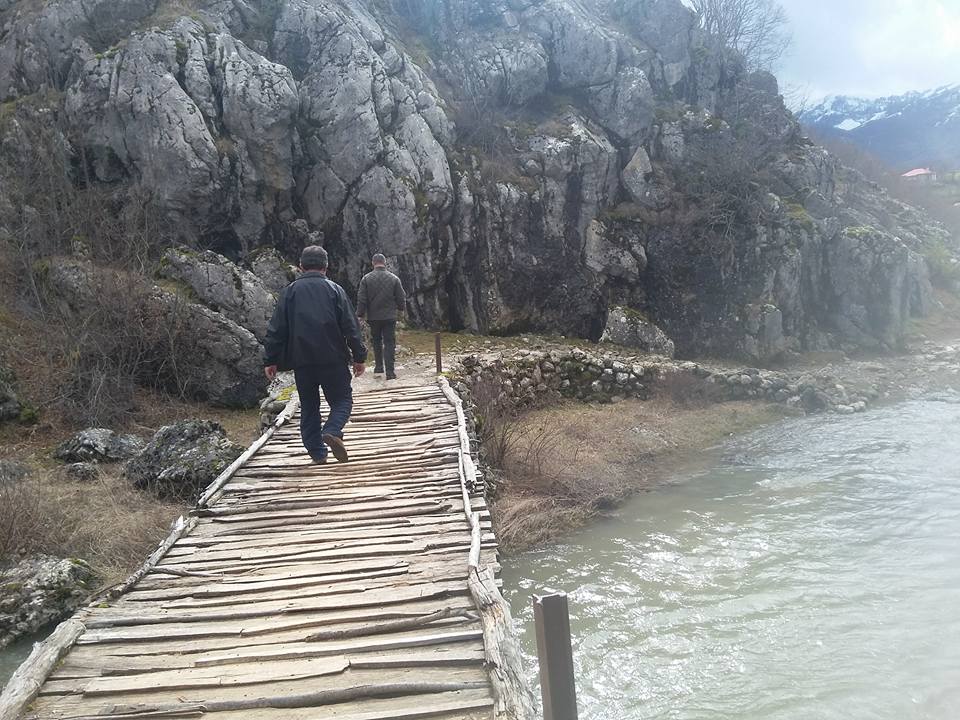 Vielleicht bei 41.711477,20.046497 (auf Google Maps)?Die Brücke verbindet über einen Pfad zwei Dörfer. Statt bei google würde ich auf topographischen Karten schauen.