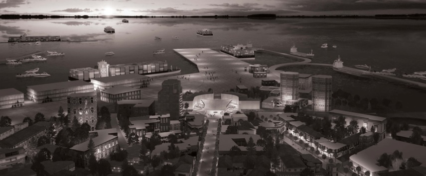 Es entsteht ein verkehrsberuhigter öffentlicher Platz von 12.000 qm und dieser wird überspannt von einem Segel von 2.000 qm (60 x 40 Meter). Der Fahrzeugverkehr verläuft unterirdisch, der Hafen wird zum Wasser hin für Besucher geöffnet! Bisher sind dort Parkplätze, Verkehrsflächen und Zäune vorhanden.
