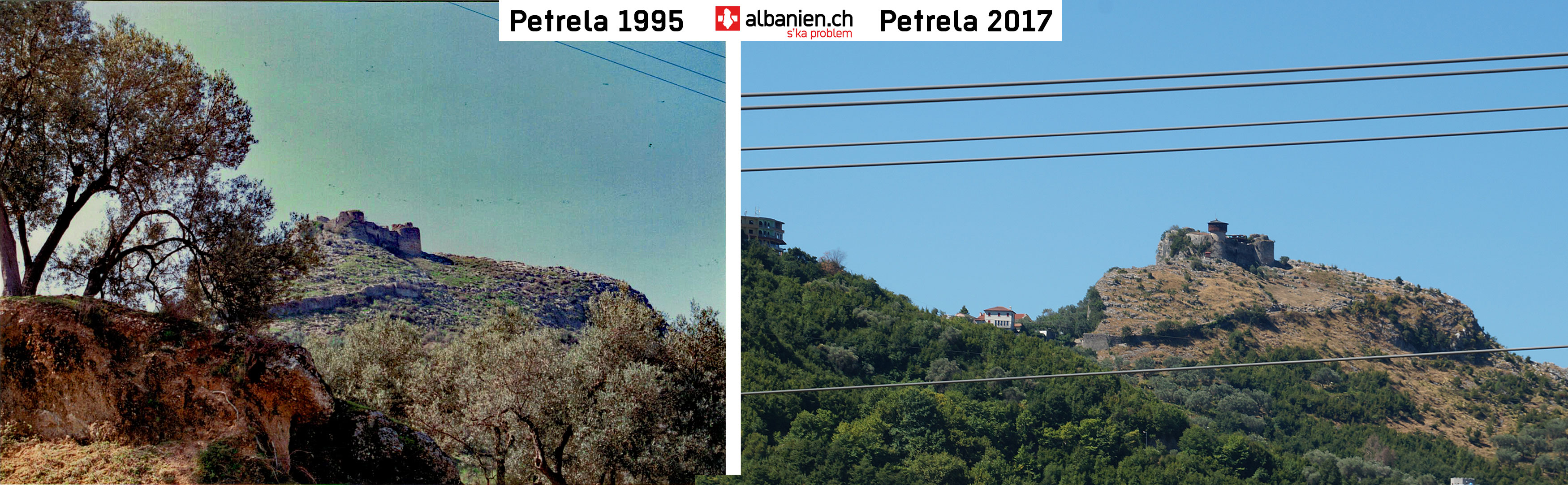 Petrela: Dorf Petrela: Blick nach TiranaDie Burg von Petrela, einem abgelegenen Bergdorf auf einer Aufnahme aus dem Jahr 1995 und 22 Jahre später. Zwischenzeitlich führt eine Autobahn am Fuss des Berges vorbei und an den Hängen finden sich zahlreiche Villen und AUsflugsrestaurants. Auch die Burg selber wurde mit Aufbauten versehen und ist jetzt ein Restaurant.