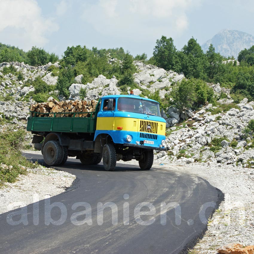 Frisch asphaltierte Strasse in den nordalbanischen Alpen – Holzlaster bei Razma