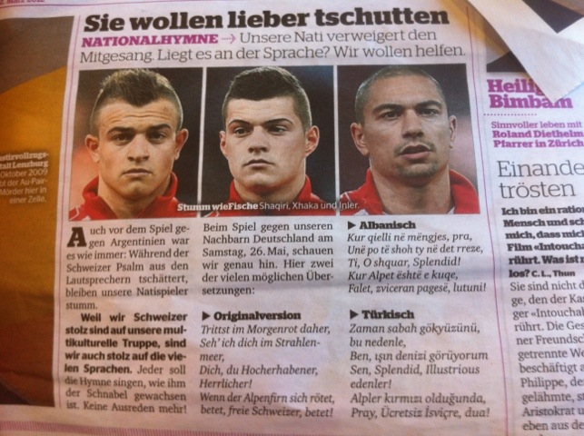 Übersetzung der Schweizer Nationalhymne für die Albaner in der Nati (und all die anderen Eingebürgerten) heute im Blick am Abend, damit jeder was zum Singen hat.