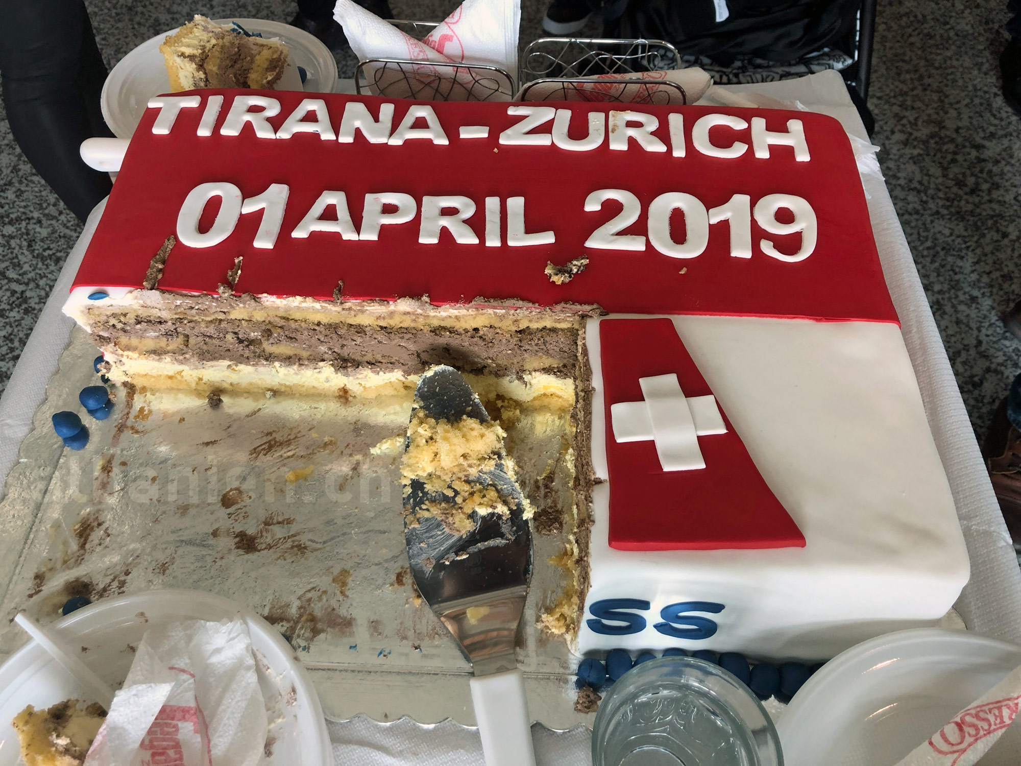 Erstflug Edelweiss Tirana-Zürich, 1. April 2019: Torte zur Feier in Tirana